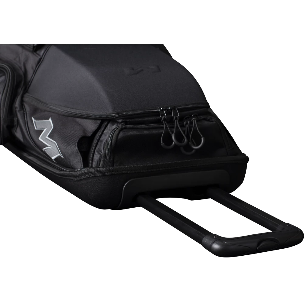 The all new Miken Pro Wheeled Bag features a a padded 4 individual bat compartment,, a telescoping handle, Wide set tank wheels with full EVA base for the ultimate support and durability, a vented shoe compartment, extra large main compartment and 2 smaller compartments, molded top converts to a shelf, removable decoration panel for customization, easy grip handles, clear ID window and durable “J” style hook.